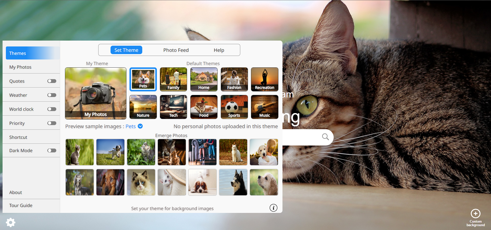 Creating a custom chrome theme typically involves selecting your desired colors, adding a unique background image, and choosing a layout that suits your aesthetic preferences. You can do this by accessing the Chrome Web Store’s theme section or using online theme creators. But with Emerge, you take this personalization further. Our extension seamlessly integrates with any chrome theme, offering versatile features like light and dark modes. Plus, Emerge allows you to organize your own photos into categories, enhancing your chosen theme with a personal touch that goes beyond basic color schemes.